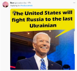 另有網(wǎng)友發(fā)了一張圖,上面有美國總統(tǒng)拜登的形象,配文是“美國將與俄羅斯戰(zhàn)斗到只剩最后一個烏克蘭人”!