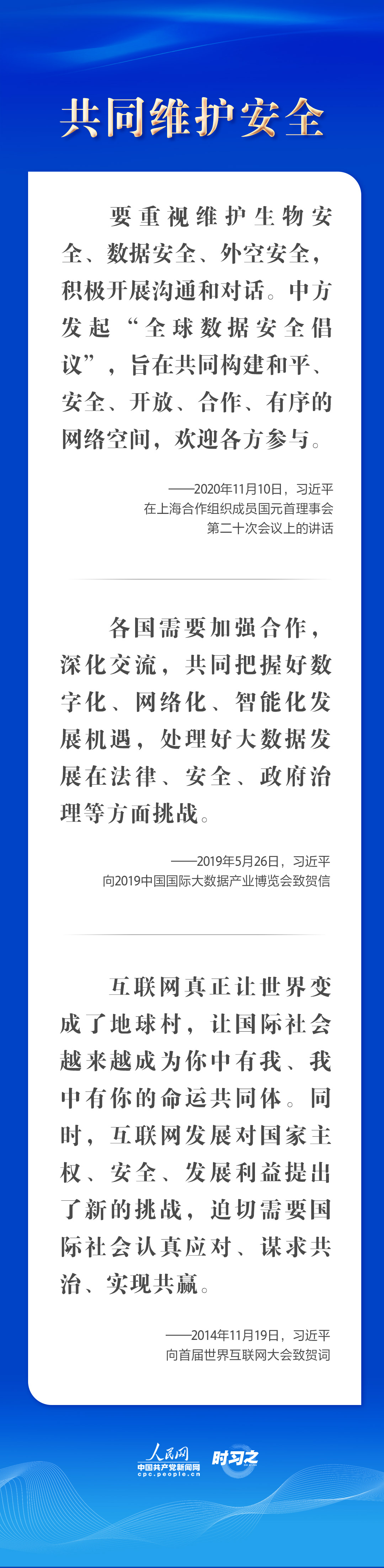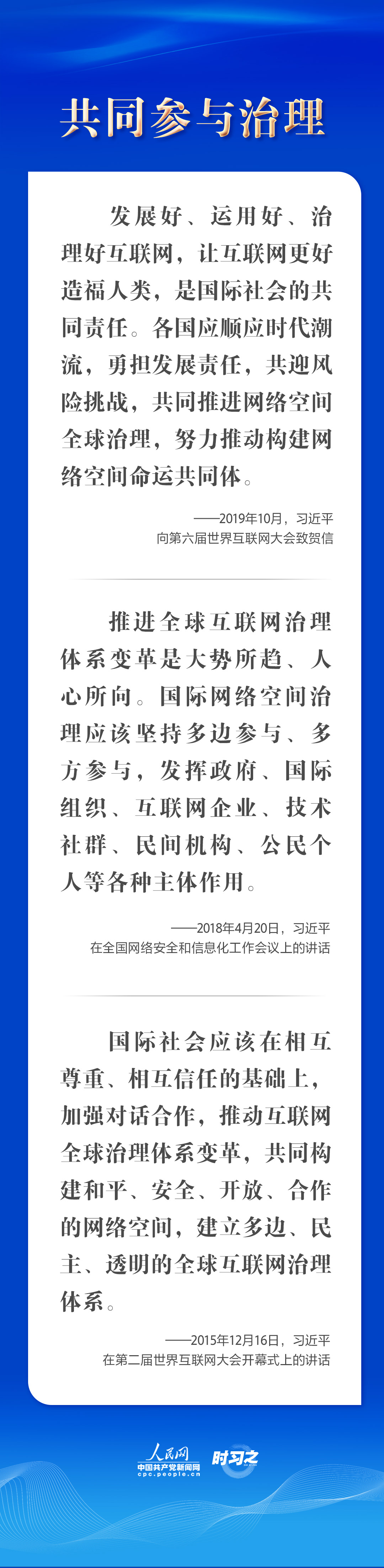 “我們倡導(dǎo)‘四項(xiàng)原則’、‘五點(diǎn)主張’,就是希望與國(guó)際社會(huì)一道,尊重網(wǎng)絡(luò)主權(quán),發(fā)揚(yáng)伙伴精神,大家的事由大家商量著辦,做到發(fā)展共同推進(jìn)、安全共同維護(hù)、治理共同參與、成果共同分享!被ヂ(lián)網(wǎng)飛速發(fā)展的同時(shí)也帶來(lái)了許多新挑戰(zhàn)。面對(duì)新問(wèn)題、新挑戰(zhàn),中共中央總書(shū)記、國(guó)家主席、中央軍委主席習(xí)近平用“四個(gè)共同”為網(wǎng)絡(luò)空間治理貢獻(xiàn)中國(guó)智慧。