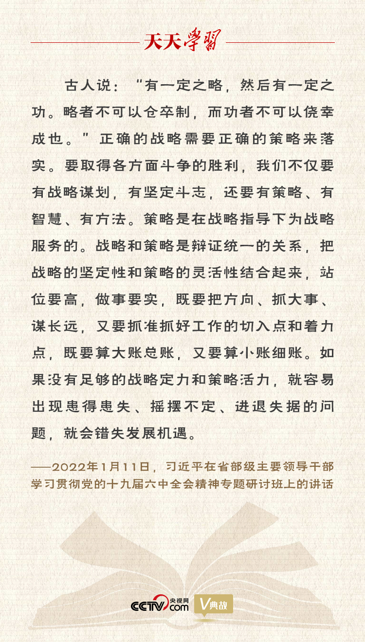 戰(zhàn)略問題是一個(gè)政黨、一個(gè)國家的根本性問題,正確的戰(zhàn)略需要正確的策略來落實(shí)。2022年1月11日,在省部級主要領(lǐng)導(dǎo)干部學(xué)習(xí)貫徹黨的十九屆六中全會精神專題研討班上,習(xí)近平總書記引用上述古語強(qiáng)調(diào):“把戰(zhàn)略的堅(jiān)定性和策略的靈活性結(jié)合起來,站位要高,做事要實(shí),既要把方向、抓大事、謀長遠(yuǎn),又要抓準(zhǔn)抓好工作的切入點(diǎn)和著力點(diǎn),既要算大賬總賬,又要算小賬細(xì)賬。”為我們在解決突出問題中實(shí)現(xiàn)戰(zhàn)略突破、在把握戰(zhàn)略全局中推進(jìn)各項(xiàng)工作提供了根本遵循。