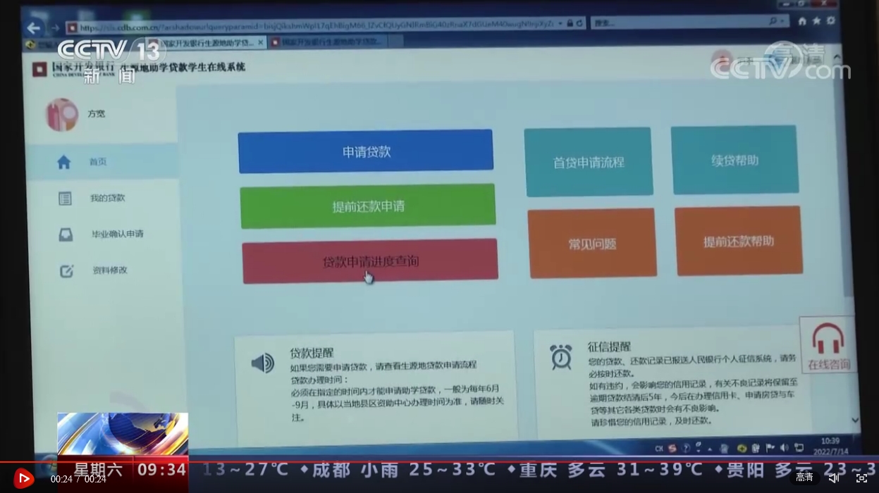 央視網(wǎng)消息:2022年7月15日起,國家開發(fā)銀行開始受理2022年國家助學(xué)貸款,部分省份農(nóng)信社承辦的國家助學(xué)貸款也將開始受理。家庭經(jīng)濟(jì)困難的學(xué)生首次辦理需出示高校錄取通知書以及本人的身份證、戶口本等,已經(jīng)獲得過助學(xué)貸款支持的學(xué)生只需在線申請(qǐng)即可辦理續(xù)貸。