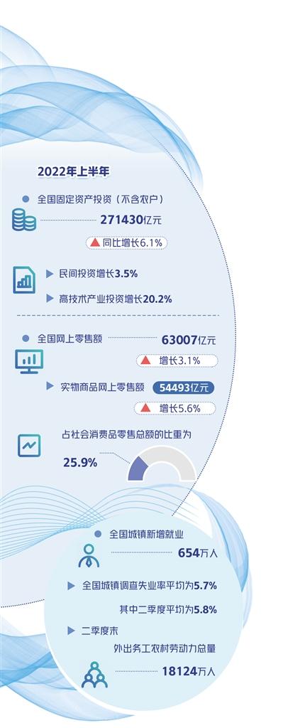 今年上半年,面對(duì)異常復(fù)雜困難局面,各地區(qū)各部門高效統(tǒng)籌疫情防控和經(jīng)濟(jì)社會(huì)發(fā)展,國民經(jīng)濟(jì)企穩(wěn)回升。固定資產(chǎn)投資持續(xù)增長,高技術(shù)產(chǎn)業(yè)和社會(huì)領(lǐng)域投資增長較快;市場銷售有所改善,基本生活類商品零售較快增長;就業(yè)形勢(shì)好轉(zhuǎn),城鎮(zhèn)調(diào)查失業(yè)率回落;居民收入穩(wěn)定增長,城鄉(xiāng)居民人均收入比值縮小,民生保障有力有效。