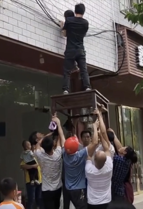 7月13日,貴州遵義一名小女孩被發(fā)現(xiàn)獨自掛在房屋外墻上,一只腳僅憑幾根電線懸吊著,而另一只腳已經(jīng)踩空,身子在半空中晃晃蕩蕩,小小的手掌眼看已經(jīng)快要抓不住窗沿,實在讓人捏一把冷汗。就在這時,周圍的路人趕緊沖上前來,一邊高聲提醒女孩千萬不要動,穩(wěn)定她的情緒,一邊抬桌子的抬桌子,救人的救人,短短十幾秒就搭起了一道"人梯",成功將小女孩安全救了下來。
