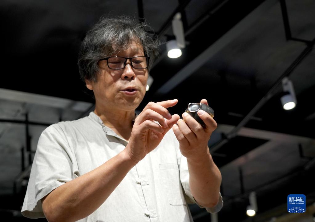 郭愛和在“洛陽三彩陶藝村”向參觀者介紹陶瓷作品(7月13日攝)。新華社記者 李安 攝