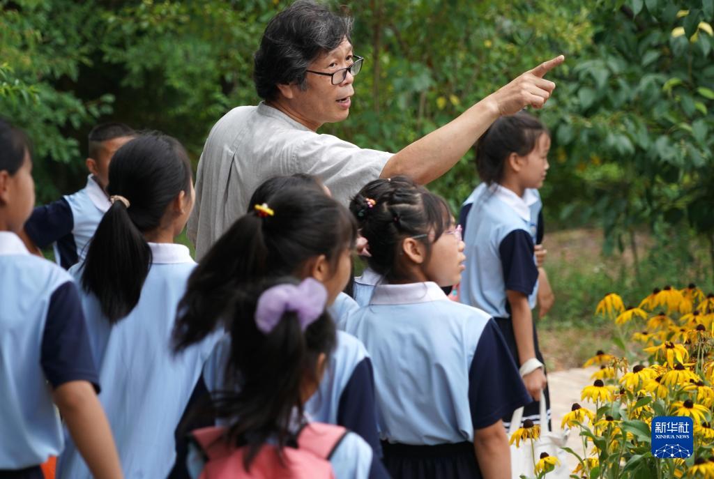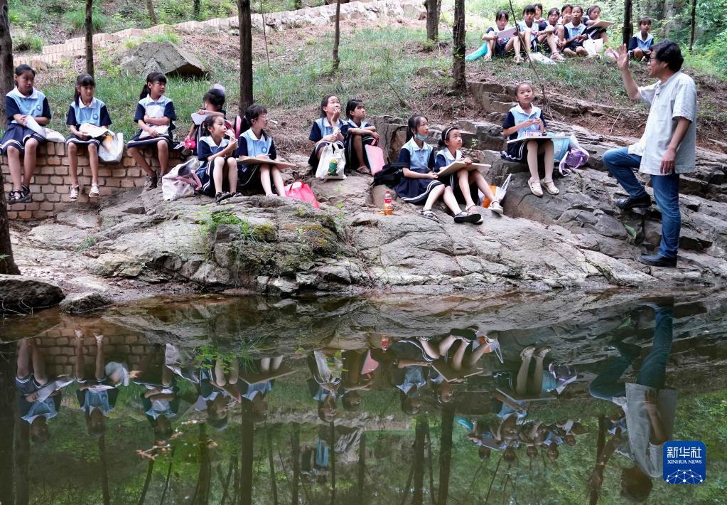 在“洛陽三彩陶藝村”,郭愛和帶領(lǐng)羅嶺鄉(xiāng)中心小學(xué)的學(xué)生寫生(7月12日攝)。新華社記者 李安 攝