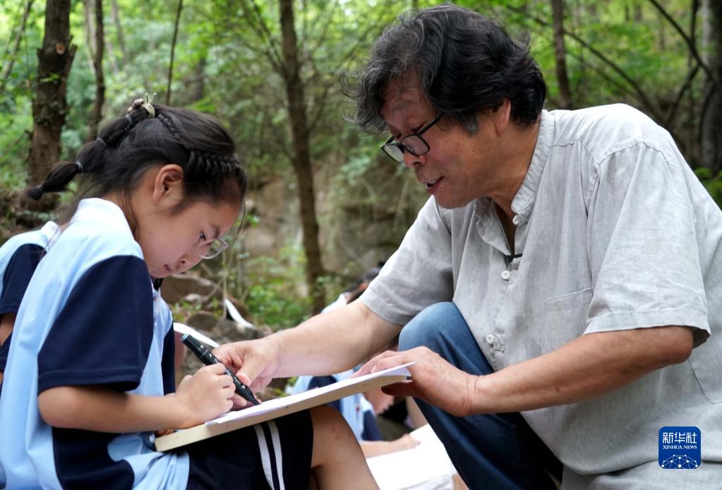 在“洛陽三彩陶藝村”,郭愛和指導(dǎo)羅嶺鄉(xiāng)中心小學(xué)學(xué)生寫生(7月12日攝)。新華社記者 李安 攝
