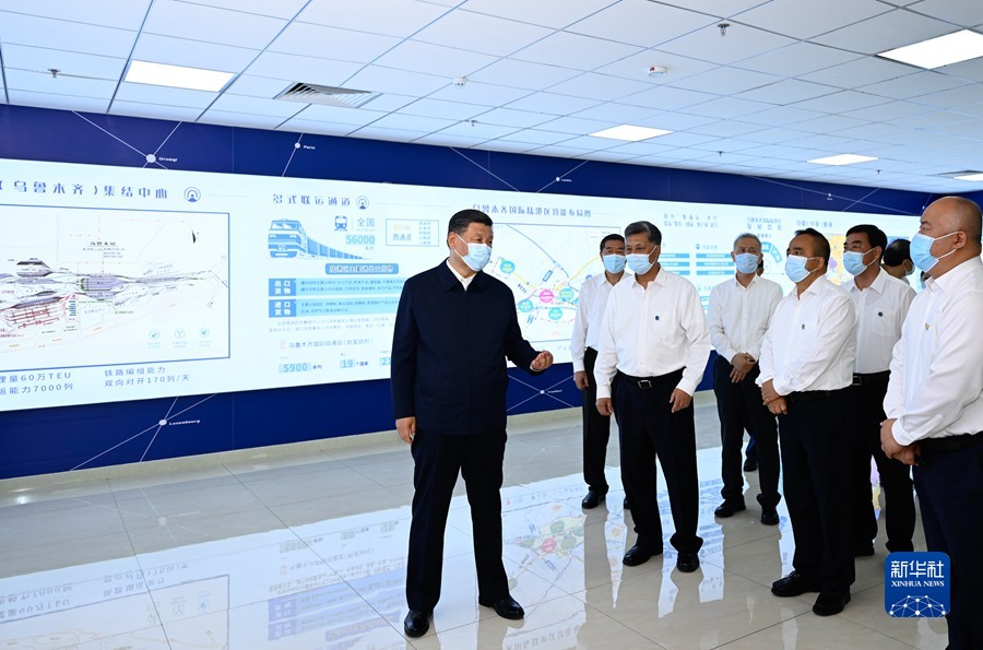 12日,習近平總書記來到烏魯木齊國際陸港區(qū)考察。在大屏幕前,習近平總書記通過實時畫面察看中歐班列(烏魯木齊)集結(jié)中心各功能區(qū)和阿拉山口口岸、霍爾果斯口岸現(xiàn)場作業(yè)情況。