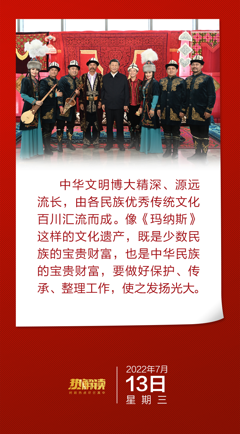 在同《瑪納斯》非物質(zhì)文化遺產(chǎn)傳承人交談時(shí),總書記要求對《瑪納斯》這類少數(shù)民族的寶貴財(cái)富、中華民族的寶貴財(cái)富,做好保護(hù)、傳承、整理工作,使之發(fā)揚(yáng)光大。