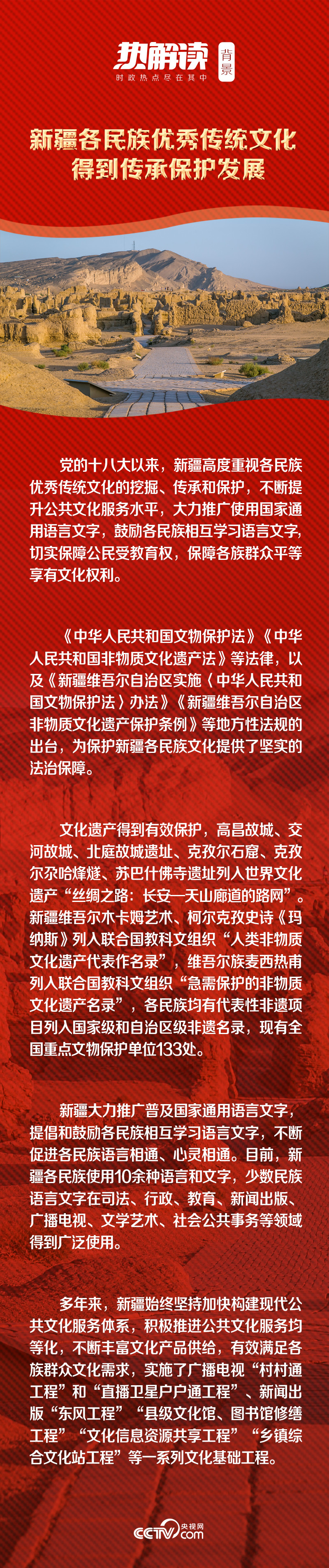 黨的十八大以來,新疆的文化教育事業(yè)駛?cè)肓丝燔嚨,各族群眾的精神生活更加豐富,這與黨中央先后出臺的一系列文化潤疆政策的落地不無關(guān)系。從社會主義核心價(jià)值觀深入人心到群眾文化活動豐富多彩,從文化產(chǎn)業(yè)發(fā)展迅速到文藝創(chuàng)作成果豐碩……新疆文化事業(yè)發(fā)展成就巨大,多層面滿足了各族人民的精神需求。