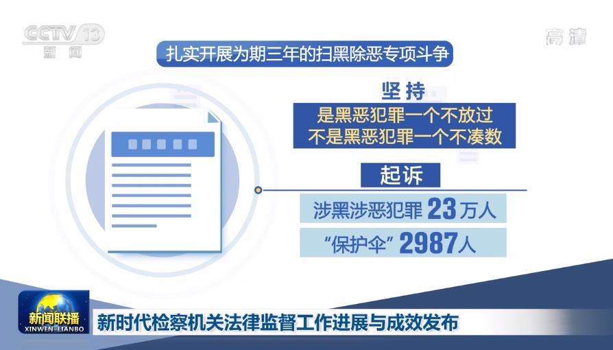 檢察機關堅持總體國家安全觀,依法懲治各類刑事犯罪。扎實開展為期三年的掃黑除惡專項斗爭,堅持“是黑惡犯罪一個不放過、不是黑惡犯罪一個不湊數(shù)”,起訴涉黑涉惡犯罪23萬人、“保護傘”2987人。