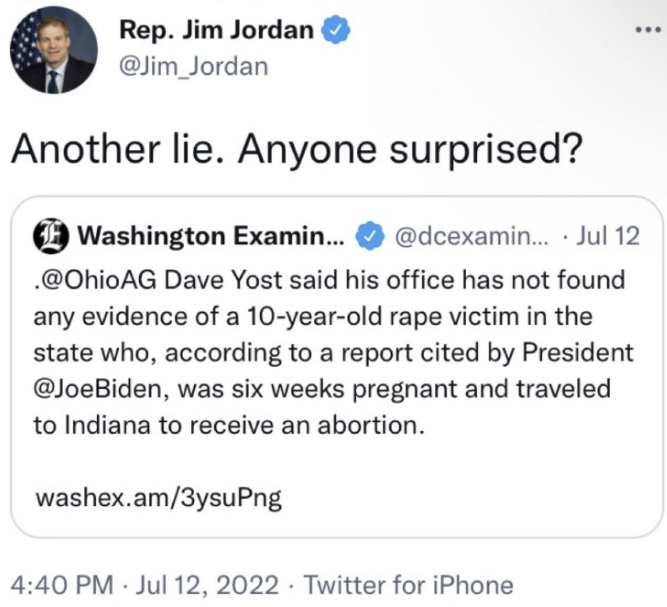 共和黨議員吉姆·喬丹(Jim Jordan)社交平臺(tái)推文截圖 (目前已刪除)