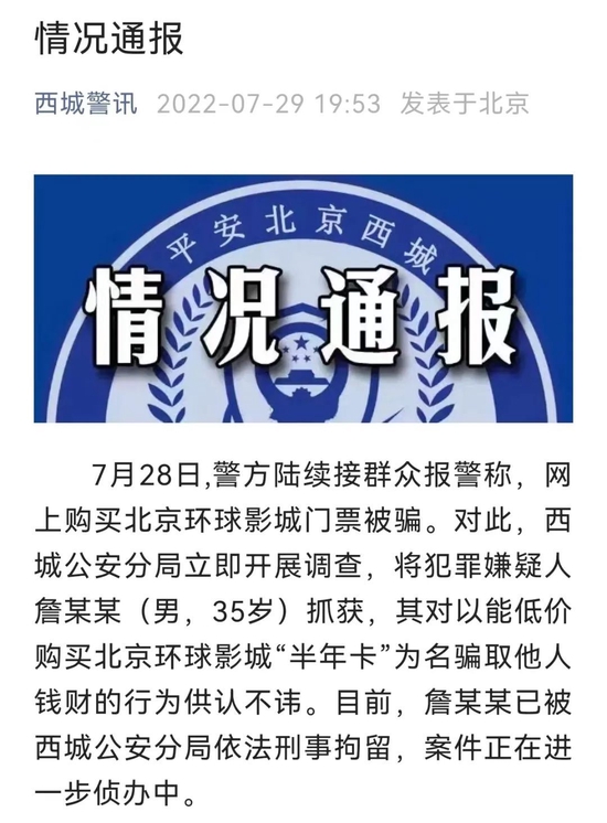 7月29日晚,北京西城警訊也發(fā)布了通報:“7月28日,警方陸續(xù)接群眾報警稱,網(wǎng)上購買北京環(huán)球度假區(qū)門票被騙。對此,西城公安分局立即開展調(diào)查,將犯罪嫌疑人詹某某(男,35歲)抓獲,其對以能低價購買北京環(huán)球度假區(qū)‘半年卡’為名騙取他人錢財?shù)男袨楣┱J不諱。目前,詹某某已被西城公安分局依法刑事拘留,案件正在進一步偵辦中!