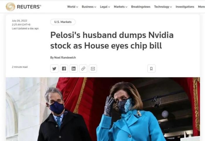 佩洛西丈夫在美眾院著眼芯片法案之際,拋售芯片制造商股票。圖片來源:路透社報道截圖