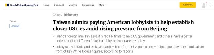 臺灣民進黨當(dāng)局承認雇傭美國說客,與美方建立更緊密聯(lián)系。圖片來源:香港《南華早報》報道截圖