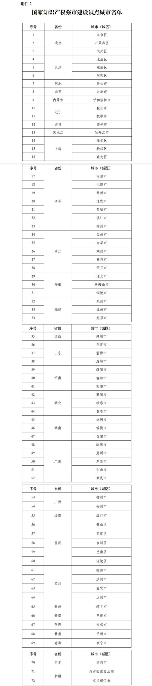 按照《國家知識產(chǎn)權(quán)局辦公室關(guān)于面向城市、縣域、園區(qū)開展知識產(chǎn)權(quán)強國建設(shè)試點示范工作的通知》(國知辦函運字〔2021〕1197號)要求,經(jīng)地方申報推薦、材料審查、專家評審等程序,確定北京市海淀區(qū)等38個城市(城區(qū))為國家知識產(chǎn)權(quán)強市建設(shè)示范城市(名單見附件1),北京市豐臺區(qū)等72個城市(城區(qū))為國家知識產(chǎn)權(quán)強市建設(shè)試點城市(名單見附件2),試點示范時限自2022年7月至2025年6月。