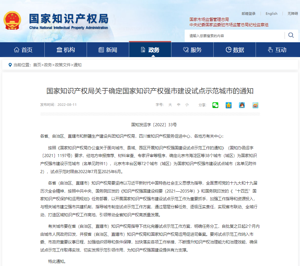 國家知識產(chǎn)權(quán)局關(guān)于確定國家知識產(chǎn)權(quán)強市建設(shè)試點示范城市的通知