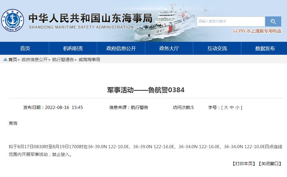 中新網(wǎng)8月17日電 據(jù)山東海事局網(wǎng)站16日消息,威海海事局發(fā)布航行警告,8月17日8時30分至8月19日17時,黃海部分海域?qū)㈤_展軍事活動,禁止駛?cè)搿?/p>
