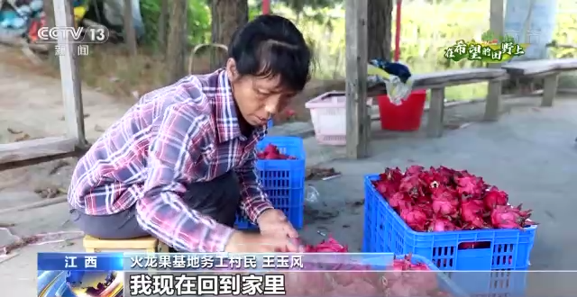火龍果基地務工村民 王玉風:以前在外面打工,我現(xiàn)在回到家里,家里發(fā)展得很好。我現(xiàn)在在這里做事,3000多塊一個月,照顧著小孩,照顧著老人。
