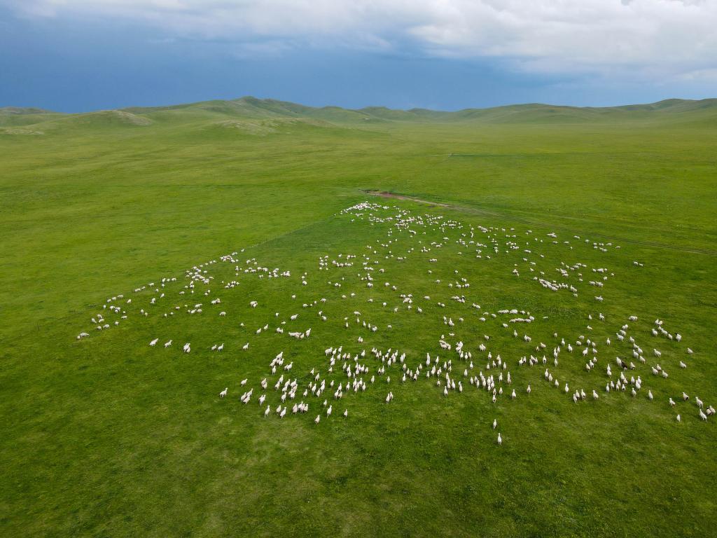 這是2022年7月27日在內(nèi)蒙古東烏珠穆沁旗拍攝的草原上的羊群(無(wú)人機(jī)照片)新華社記者 王澤聰 攝