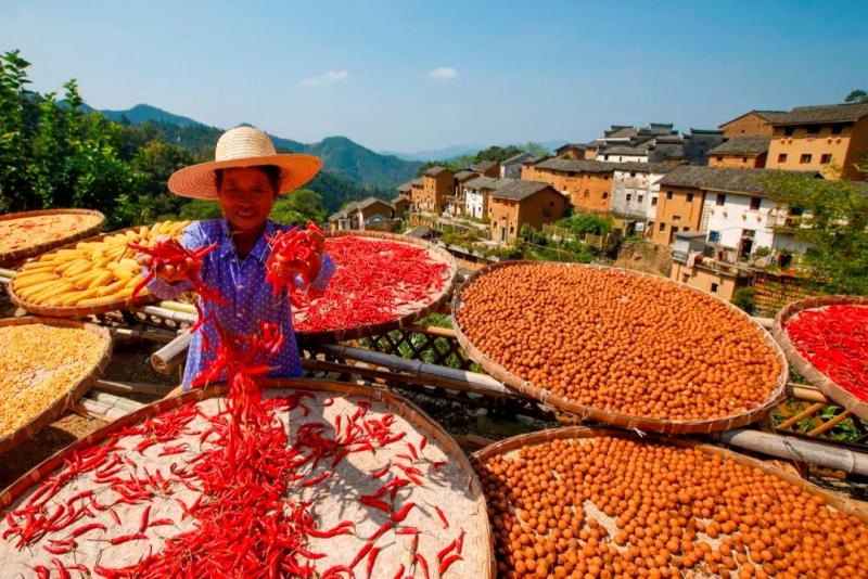 在安徽歙縣陽產(chǎn)村的土樓群,村民們搶抓晴好天氣,晾曬農(nóng)作物——金黃的玉米、橘黃的南瓜、淡黃的核桃、火紅的辣椒……呈現(xiàn)出一幅幅色彩斑斕的“曬秋圖”。