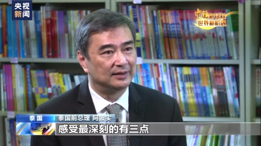 泰國前總理阿披實表示,習近平主席對治理國家有堅定的信念和清晰的思路,中國共產(chǎn)黨的管理經(jīng)驗值得借鑒。
