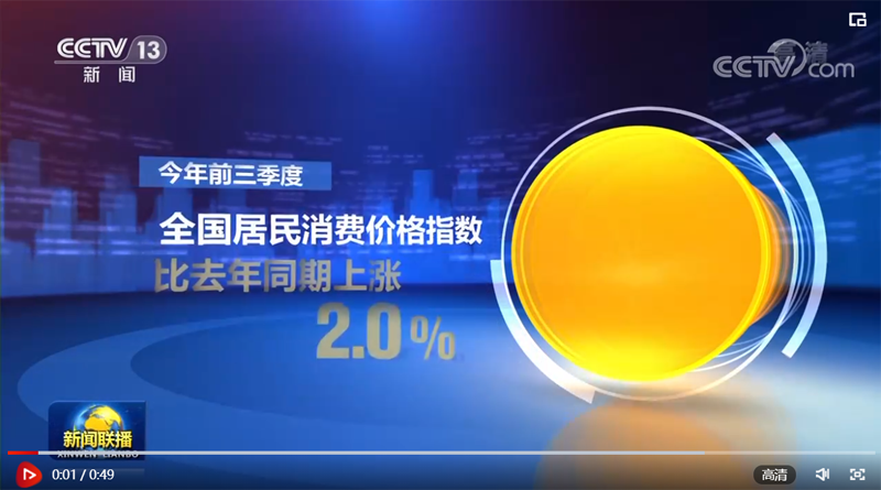 央視網消息(新聞聯播):國家統計局今天(10月14日)公布的數據顯示,今年前三季度,全國居民消費價格指數,也就是CPI,比去年同期上漲2.0%。