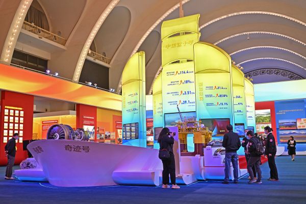10月8日,觀眾在“奮進新時代”主題成就展中央綜合展區(qū)內(nèi)參觀中國經(jīng)濟“奇跡”號巨輪模型。(新華社發(fā))