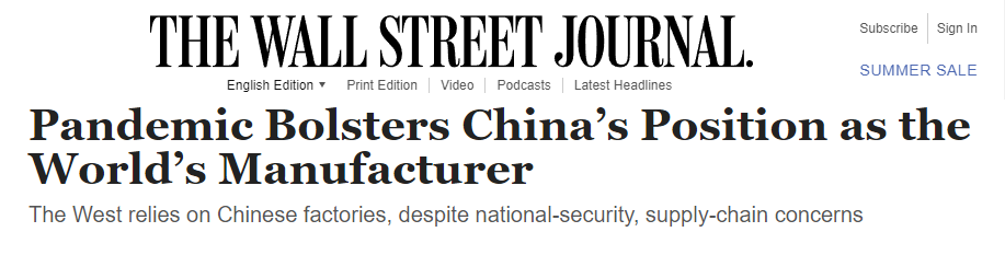 這也解釋了《華爾街日?qǐng)?bào)》所報(bào)道的,盡管西方各國都在談?wù)摐p少對(duì)中國工廠的依賴,但中國在過去兩年依然鞏固了其作為世界主要制造業(yè)大國的地位。