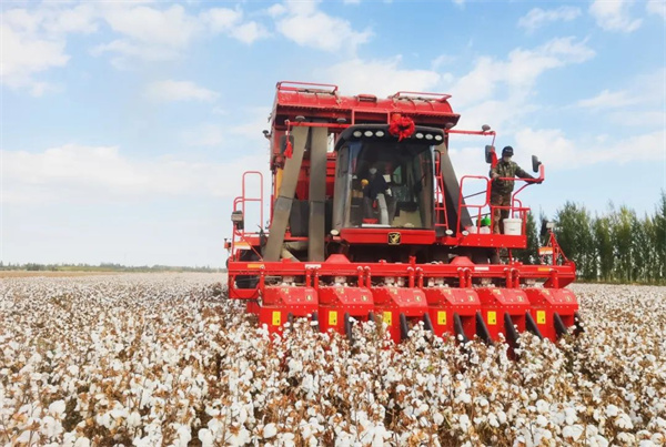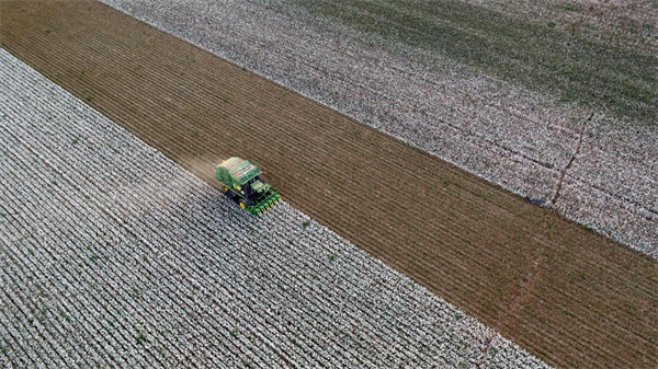 在新疆塔城地區(qū)烏蘇市棉田中,最新款的國產采棉機大顯身手,每隔30多分鐘便能“吐出”一個2噸左右的巨大“金蛋”;在阿克蘇地區(qū)沙雅縣,190余萬畝棉花喜迎豐收,棉田中采棉機來回穿梭作業(yè),確保朵朵新棉及時歸倉;在新疆生產建設兵團第五師,75萬畝棉花采收全程實現(xiàn)機械化。