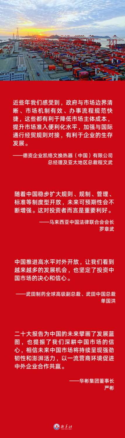 二十大報告中關于推進高水平對外開放的內(nèi)容同樣受到國際社會高度關注。全球工商界人士表示,中國營商環(huán)境持續(xù)改善,其進程令人振奮,中國穩(wěn)步擴大制度型開放的前景讓人期待。