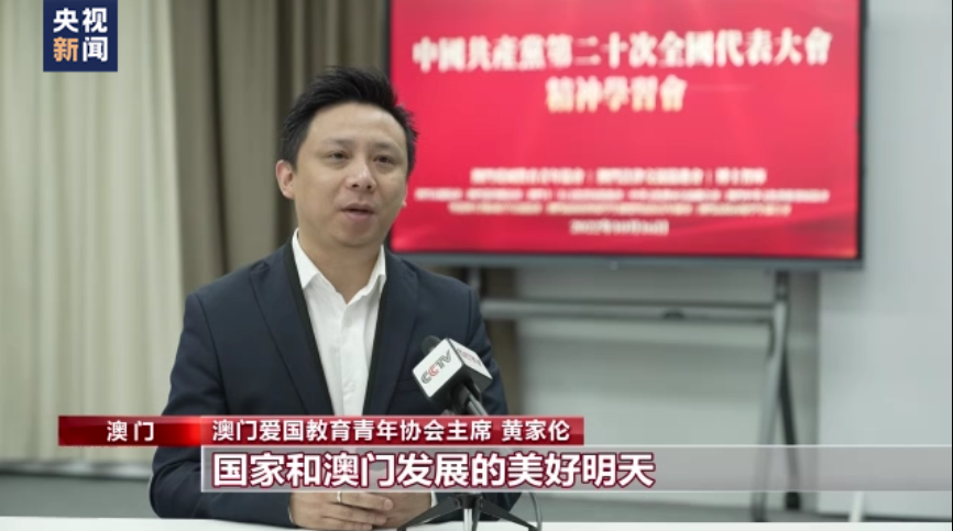 澳門愛國教育青年協(xié)會主席 黃家倫:聽了習(xí)近平總書記的報告后,大家的心情都特別激動,也非常受鼓舞。報告不僅展示了國家和澳門發(fā)展的美好明天,也將為港澳青年施展才華開辟更廣闊的天地。作為澳門青年,我覺得要立志民族復(fù)興,一方面要傳承好愛國愛澳的優(yōu)良傳統(tǒng),同時也要把個人成長和貢獻(xiàn)國家緊密聯(lián)系在一起。