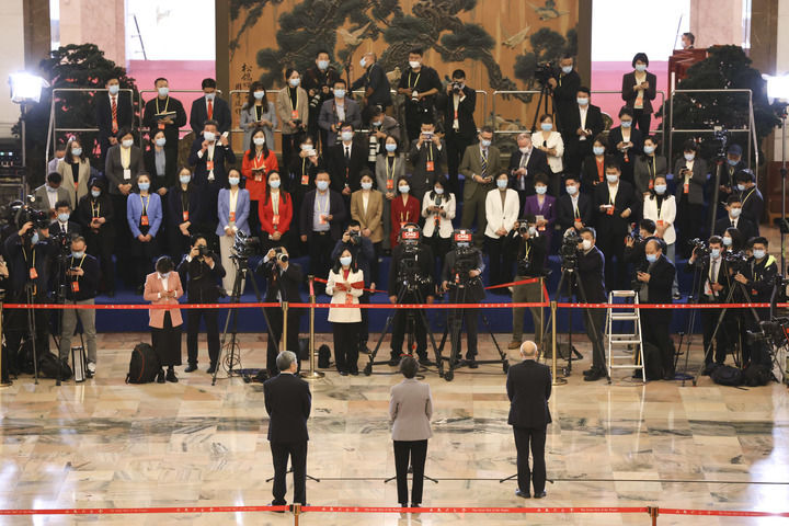王旭東、錢素云、謝春濤代表(自左至右)在“黨代表通道”接受采訪。新華社記者 金良快 攝