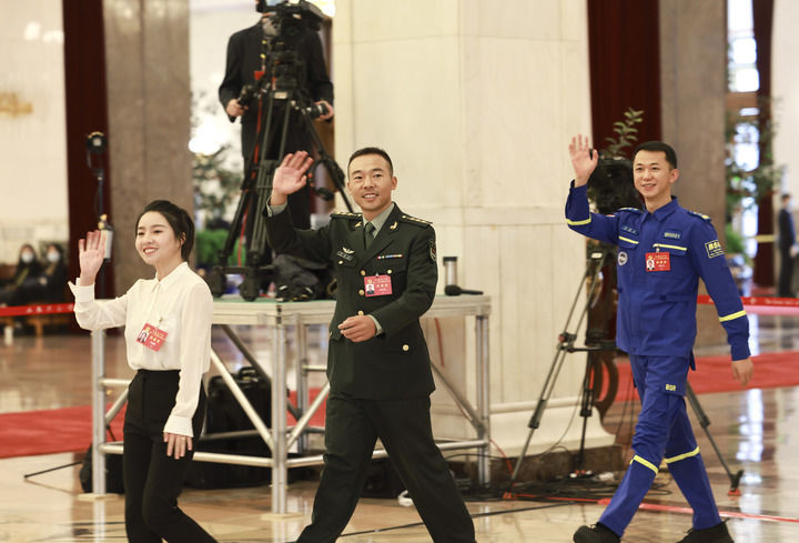 吳燕生、朱敏、張連鋼代表(自左至右)步入“黨代表通道”,準備接受采訪。新華社記者 金良快 攝