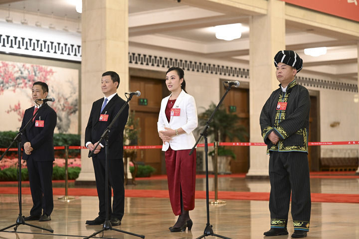 楊彥鋒、宋學(xué)文、祁洪芳、李紹杰代表(自左至右)在“黨代表通道”接受采訪。新華社記者 金良快 攝