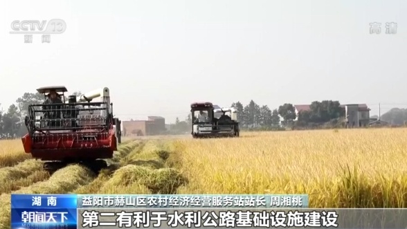 總臺(tái)記者 鄢俊琪:我現(xiàn)在所在的位置是江西省上饒市萬年縣的湖云鄉(xiāng),這里地處鄱陽湖平原的腹地,鄱陽湖平原是江西產(chǎn)糧的一個(gè)大區(qū)域,這里也是一個(gè)重要的產(chǎn)地。大家可以看到在我身后的高標(biāo)準(zhǔn)農(nóng)田里,一臺(tái)臺(tái)收割機(jī)正在開足馬力抓緊收割,確保我們的秋糧顆粒歸倉。