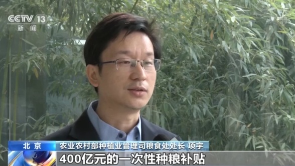 農(nóng)業(yè)農(nóng)村部種植業(yè)管理司糧食處處長 項(xiàng)宇:中央財(cái)政3次向?qū)嶋H種糧農(nóng)民合計(jì)發(fā)放400億元一次性種糧補(bǔ)貼、比上年翻了一番。擴(kuò)大了輪作資金規(guī)模補(bǔ)助大豆玉米帶狀復(fù)合種植,釋放了重農(nóng)抓糧的強(qiáng)烈信號(hào)。