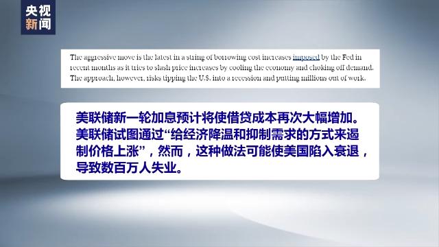 美國廣播公司發(fā)表評論稱,美聯(lián)儲新一輪加息預(yù)計將使借貸成本再次大幅增加。美聯(lián)儲試圖通過“給經(jīng)濟降溫和抑制需求的方式來遏制價格上漲”,然而,這種做法可能使美國陷入衰退,導(dǎo)致數(shù)百萬人失業(yè)。