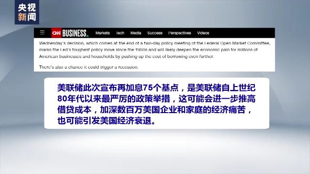 美國有線電視新聞網(wǎng)評論稱,美聯(lián)儲此次宣布再加息75個基點,是美聯(lián)儲自上世紀(jì)80年代以來最嚴(yán)厲的政策舉措,這可能會進一步推高借貸成本,加深數(shù)百萬美國企業(yè)和家庭的經(jīng)濟痛苦,也可能引發(fā)美國經(jīng)濟衰退。