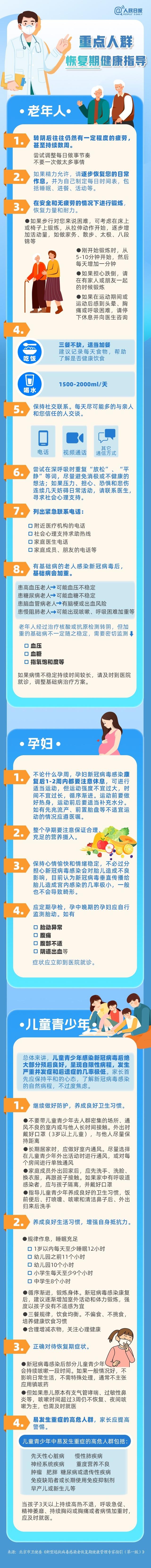 新冠病毒感染恢復期,雖然核酸、抗原檢測結果已經轉陰,但機體尚未恢復到病前水平,需要1到2周甚至更長時間才能完全緩解。老年人恢復期間需要注意哪些指標?孕婦出現(xiàn)哪些癥狀應及時就診?哪些兒童青少年是重癥高危人群?一圖了解重點人群恢復期健康指導。