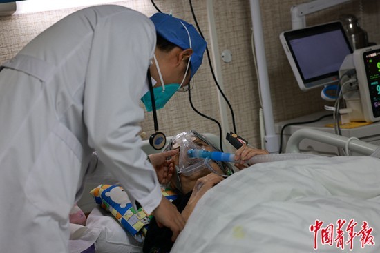 12月27日,北京朝陽醫(yī)院發(fā)熱門診留觀病房,呼吸與危重癥醫(yī)學(xué)科主任醫(yī)師賀航詠在與重癥患者溝通。