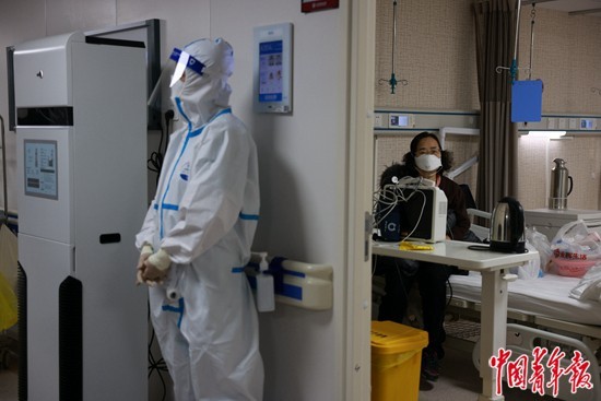 12月27日,北京朝陽醫(yī)院發(fā)熱門診留觀病房,一名病情趨于平穩(wěn)的新冠重癥患者準(zhǔn)備轉(zhuǎn)移到其他病房,一名醫(yī)護(hù)人員在門外時(shí)刻待命。每騰空一張病床,就意味著多一名患者能獲得治療的機(jī)會(huì)。