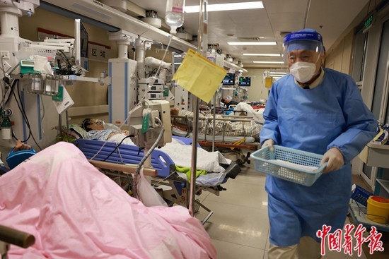 12月27日,記者在北京朝陽醫(yī)院急診科看到,診室已從3個(gè)增加至6個(gè),?撇》俊叭?苹,全部改為了綜合病房,過道里也排滿了臨時(shí)床位。急診科收治重癥患者的病房均由呼吸、重癥、急診的專家領(lǐng)軍,其他?频拇蠓蚝妥o(hù)士支援,盡可能減少重癥病死率。“很多重癥病人慕名而來,我們也會(huì)盡最大努力收治。”朝陽醫(yī)院黨委委員、急診醫(yī)學(xué)科副主任梅雪說,“這不是平時(shí)的看病了,這像是打一場(chǎng)仗!