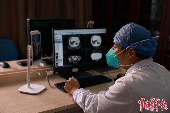 12月27日,北京朝陽醫(yī)院,腫瘤科副主任醫(yī)師關(guān)印在互聯(lián)網(wǎng)診室內(nèi)為患者遠(yuǎn)程看病;颊呦螺d“朝陽健康云”APP,即可預(yù)約在線問診。