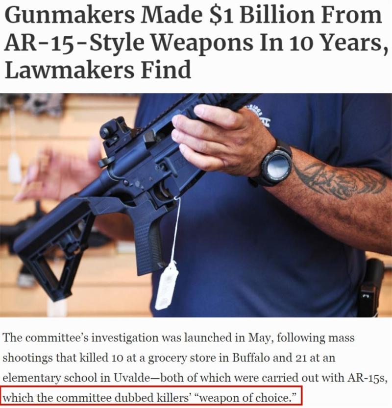 美國(guó)國(guó)會(huì)眾議院監(jiān)督與改革委員會(huì)去年公布的調(diào)查報(bào)告顯示,隨著過去十年槍支暴力事件的激增,美國(guó)五大主要槍支制造商僅靠銷售AR-15型半自動(dòng)步槍就獲利超過10億美元。