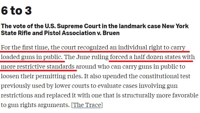 “追蹤”網(wǎng)站:美國(guó)聯(lián)邦最高法院以6比3的表決結(jié)果,首次承認(rèn)個(gè)人有權(quán)在公共場(chǎng)所攜帶上膛的槍支。這一裁決迫使曾有嚴(yán)格控槍標(biāo)準(zhǔn)的6個(gè)州放寬了限制,同時(shí)還顛覆了以前由下級(jí)法院對(duì)憲法第二修正案的解釋權(quán)。