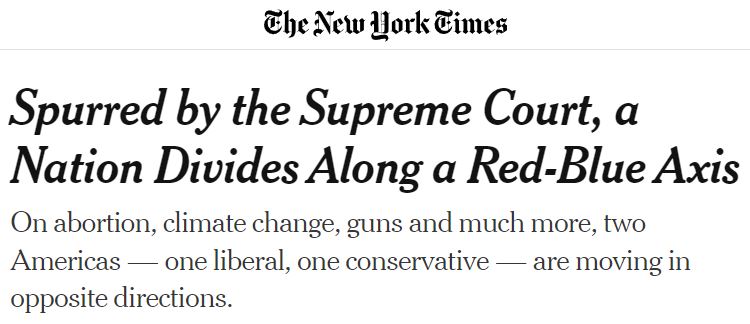 《紐約時(shí)報(bào)》評(píng)論稱,在最高法院的推動(dòng)下,“兩個(gè)美國(guó)”正在以紅色(代表共和黨)和藍(lán)色(代表民主黨)為界,朝著相反的方向發(fā)展。