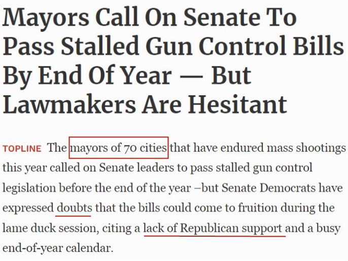 2022年發(fā)生過大規(guī)模槍擊案的70個(gè)美國(guó)城市的市長(zhǎng)12月初聯(lián)名致信國(guó)會(huì)參議院兩黨領(lǐng)導(dǎo)人,呼吁他們?cè)?022年底前通過一直擱淺的上述兩項(xiàng)法案。但民主黨人表示,由于缺乏共和黨人的支持,參議院通過這些法案的前景并不樂觀。