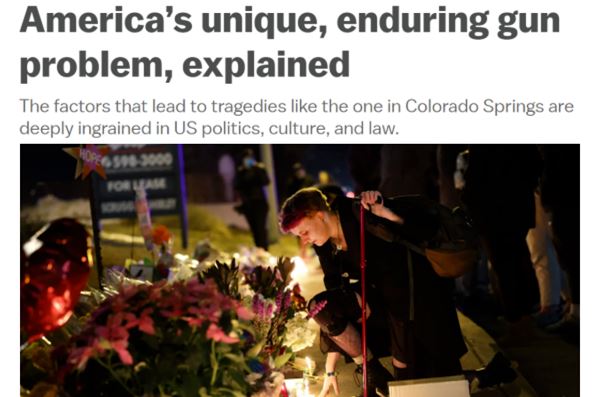 在美國(guó)沃克斯新聞網(wǎng)看來(lái),美國(guó)的槍支暴力問題之所以“獨(dú)特而持久”,是因?yàn)閾順層^念自美國(guó)建立之日起就深深植根于該國(guó)政治、文化和法律之中。