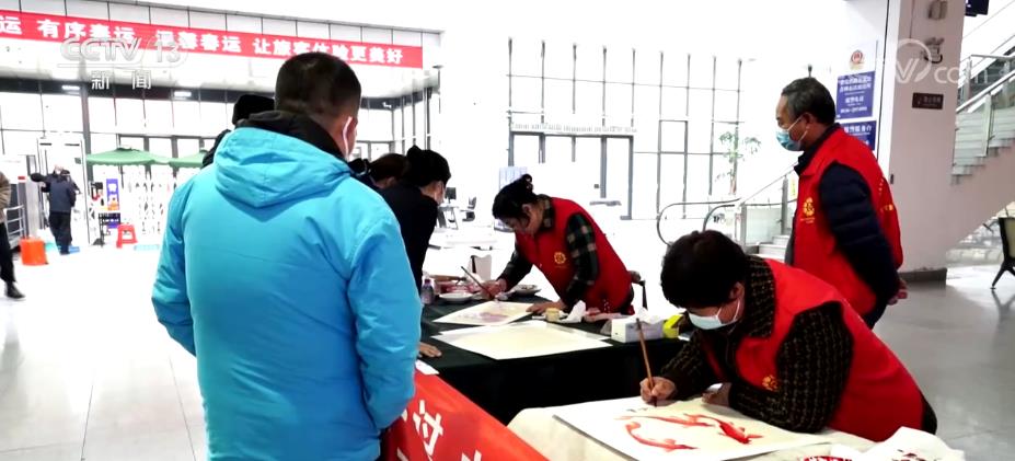 在山東濰坊火車站的候車大廳,濰坊風(fēng)箏、楊家埠木版年畫、高密泥塑等琳瑯滿目,吸引了不少旅客的目光。非遺傳承人和書法家也走進(jìn)候車大廳,為返鄉(xiāng)的旅客送去真摯的新年祝福。在青州火車站,書法家們還現(xiàn)場揮毫潑墨,一張張包含祝福的“!弊郑屄每蛡兏惺艿綕鉂獾哪晡。