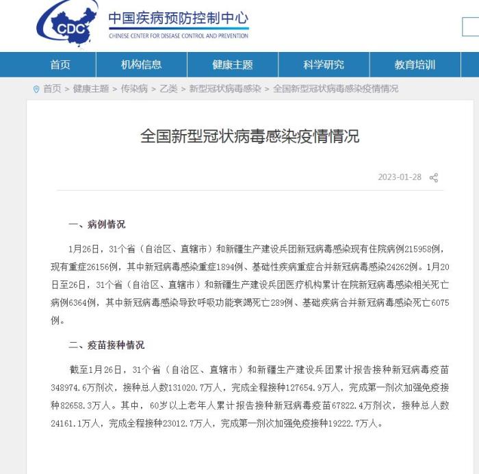中疾控發(fā)布全國(guó)新型冠狀病毒感染疫情情況