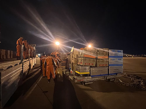 當(dāng)?shù)貢r(shí)間2月8日凌晨4點(diǎn)30分(北京時(shí)間9時(shí)30分),中國救援隊(duì)一行82人經(jīng)過約10小時(shí)的飛行,抵達(dá)土耳其阿達(dá)納機(jī)場。隊(duì)長趙明介紹,根據(jù)當(dāng)?shù)貙?shí)際情況,中國救援隊(duì)立即開展卸貨轉(zhuǎn)運(yùn)工作,盡快做好與我駐土耳其使館、當(dāng)?shù)卣、?lián)合國有關(guān)機(jī)構(gòu)對接,結(jié)合目前救援進(jìn)展情況,接領(lǐng)具體搜救行動任務(wù),并擬派出救援小隊(duì)對執(zhí)行任務(wù)場地進(jìn)行實(shí)地勘查,同時(shí)選擇安全合適的位置搭建營地。